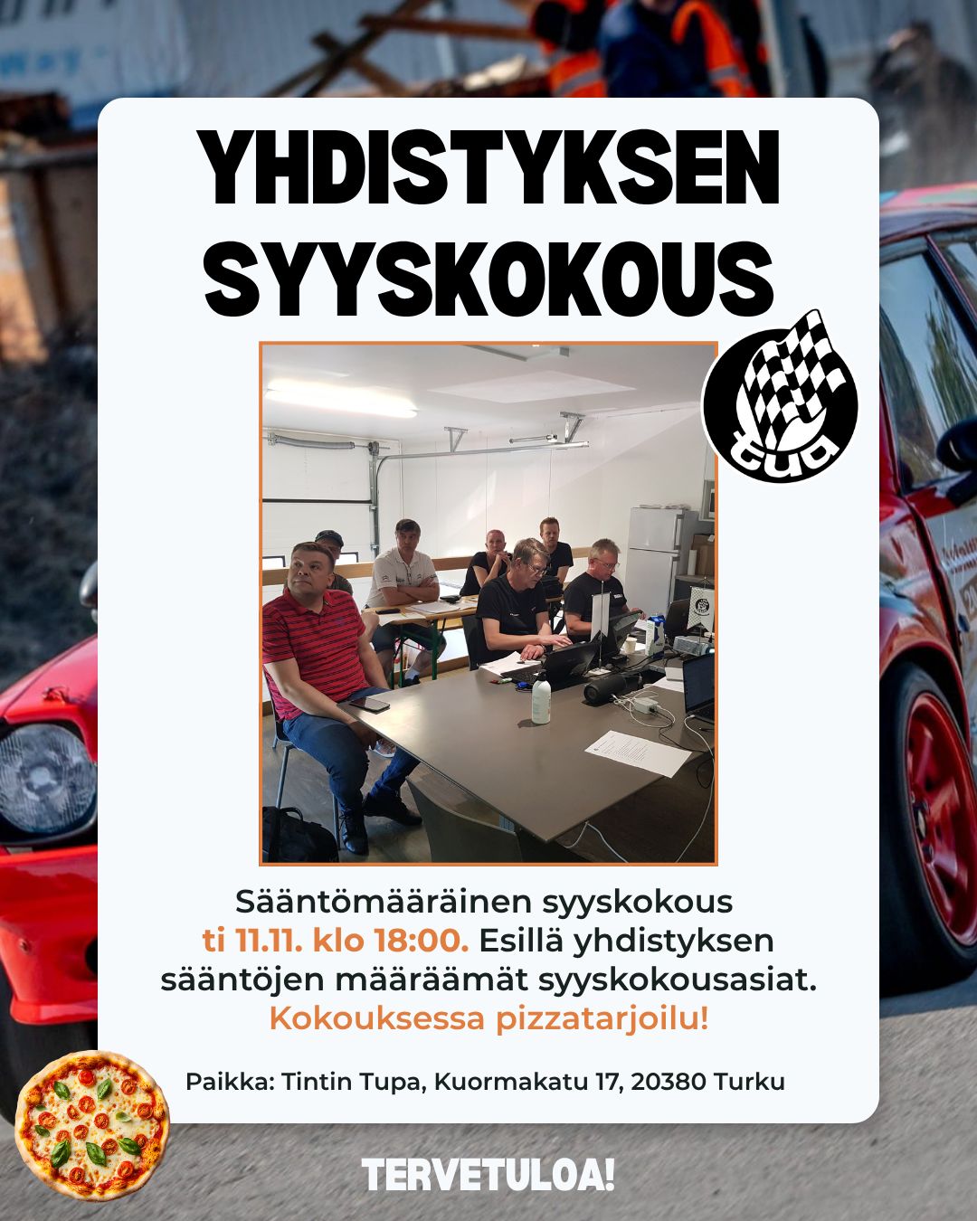 Turun Urheiluautoilijat ry:n sääntömääräinen syyskokous tiistaina 11.11 klo 18:00, paikka Tintin Tupa, Kuormakatu 17, 20380 Turku. Esillä yhdistyksen sääntöjen määräämät syyskokousasiat. Tervetuloa!